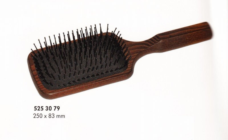 Kartáč na vlasy KELLER z řady Thermo Line je kvalitní plochý rovný kartáč, který umožňuje šetrné a účinné pročesávání vlasů. Je vybaven pneumatickým polštářkem s plastovými kolíčky v 11 řadách, které jsou zakončené kuličkou, což zajišťuje komfortní pročesávání a minimalizuje riziko poškození vlasů. Kartáč má rozměry 250 x 83 mm a je vyroben v Německu s vysokou pozorností k detailu a kvalitě.